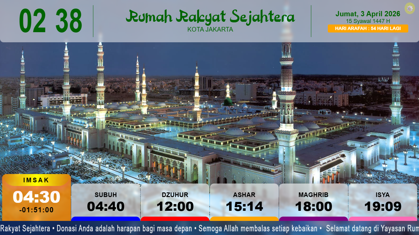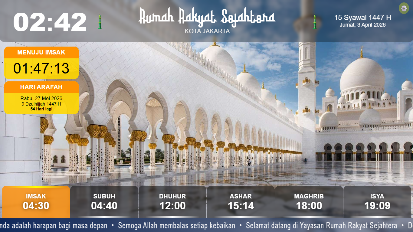 Yayasan Rumah Rakyat Sejahtera (YRRS) Jakarta meluncurkan program bantuan pengadaan jam TV digital masjid untuk musholla dan masjid di wilayah Jawa. Bantuan ini bertujuan untuk membantu pengelolaan waktu ibadah yang lebih tepat dan memudahkan para jamaah dalam mengikuti jadwal sholat dan informasi informasi yang telah di buat oleh DKM. Program ini merupakan langkah awal YRRS dalam upaya meningkatkan kualitas fasilitas rumah ibadah di Indonesia.